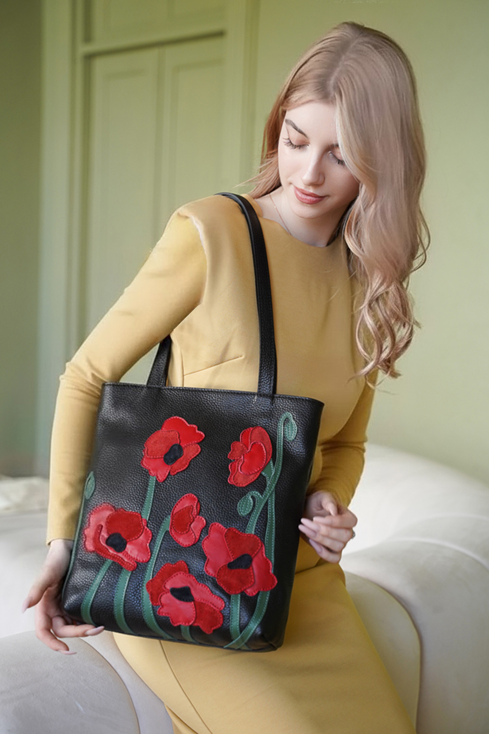 Сумка женская с аппликацией "Маки" с удлиненными ручками на плечо. Сумка застегивается на молнию и имеет одно отделение. На задней стенке расположен карман на молнии. Сумка на подкладке. Внутри сумка имеет карман на молнии и карман на молнии из плотного материала. Сумка с аппликацией в заказе может незначительно отличаться от оригинала (фото) по фактуре и оттенку кожи.