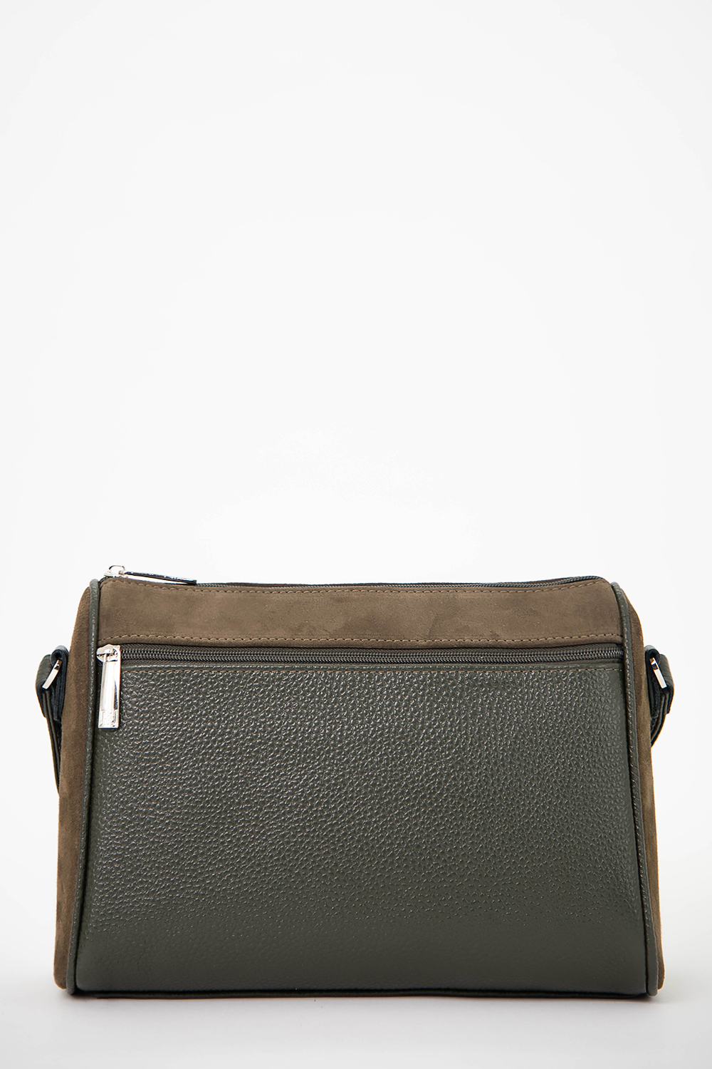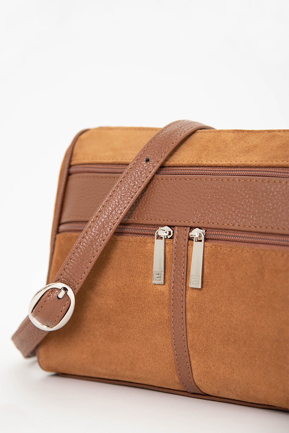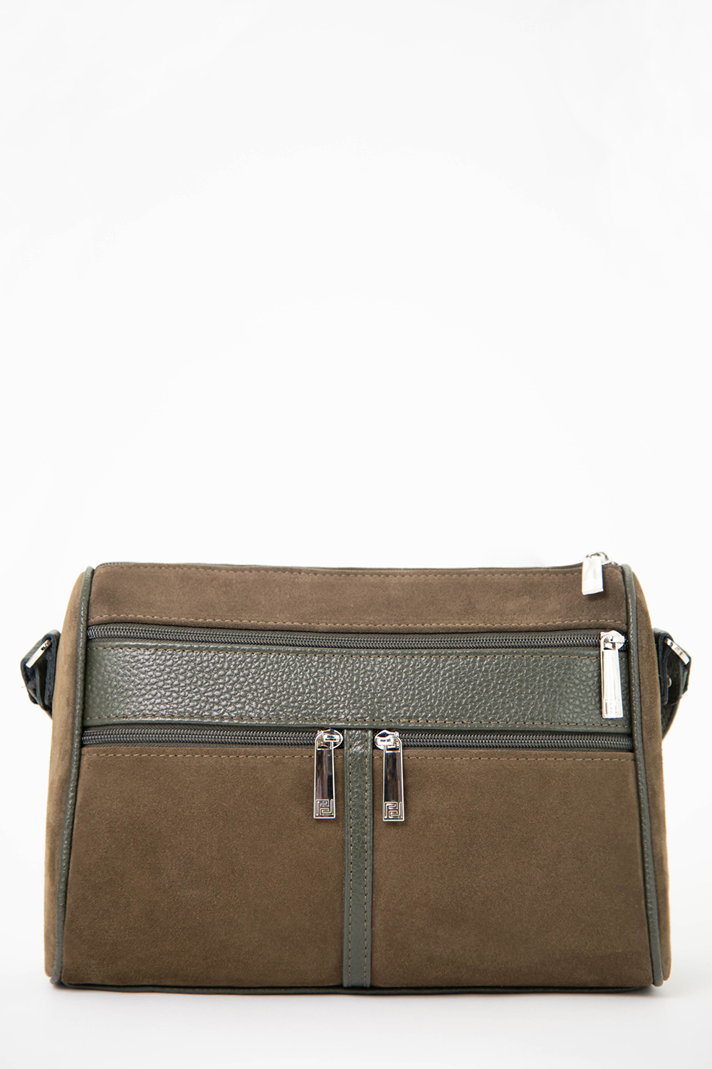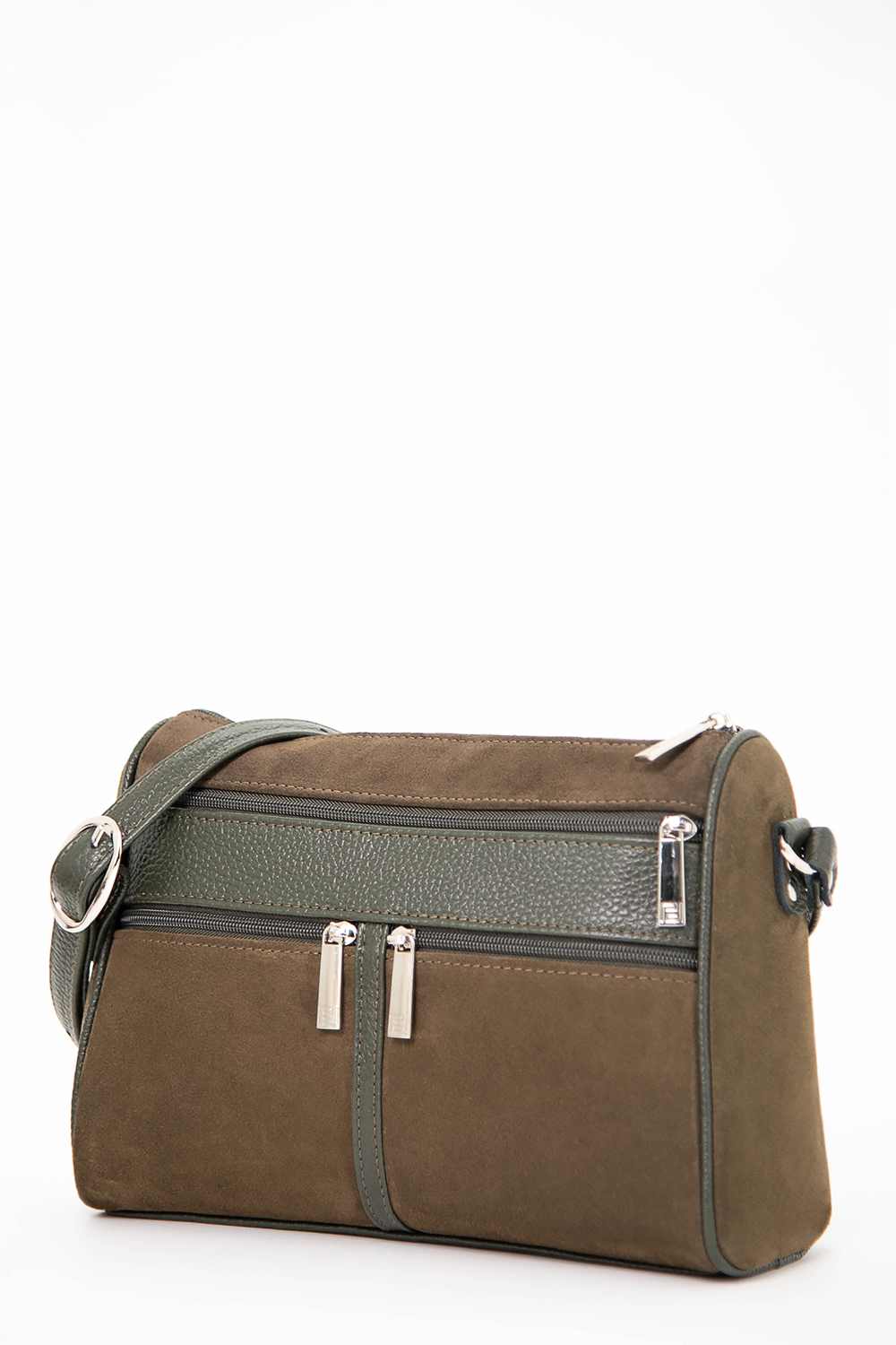 Сумка женская среднего размера с несъемным регулируемым ремнем через плечо. Сумка застегивается на молнию и имеет одно отделение. На передней стенке расположены один большой верхний карман на молнии и два маленьких нижних кармана на молнии. На задней стенке также есть карман на молнии. Сумка на подкладке. Внутри сумка имеет карман на молнии, накладной карман для мобильного телефона и визиток.