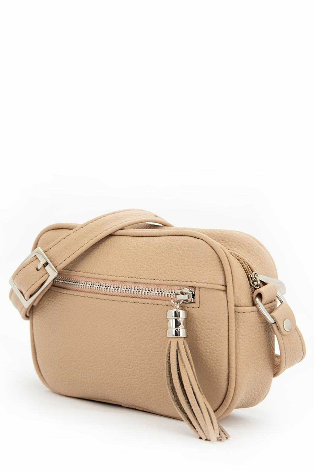 Сумка женская небольшого размера с несъемным регулируемым ремнем через плечо. Сумка застегивается на молнию и имеет одно отделение. На передней стенке расположен карман с металлической молнией и кисточкой. На задней стенке также есть карман на молнии. Сумка на подкладке. Внутри сумка имеет два кармана на молнии.