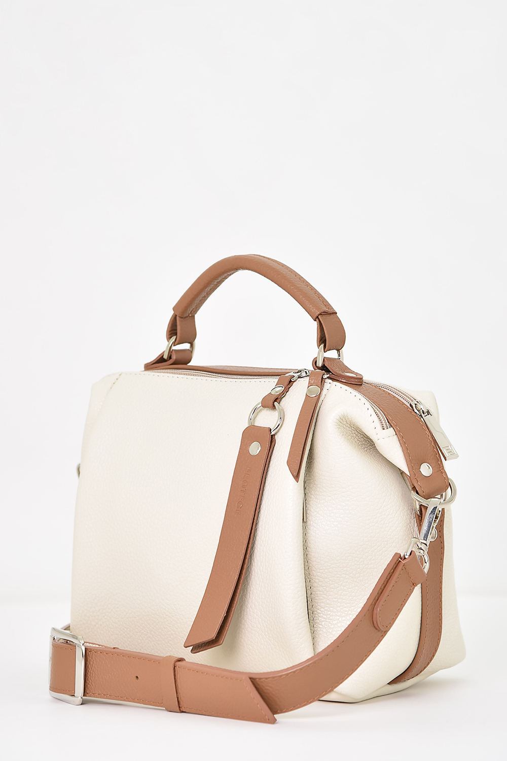 Сумка женская мягкой формы с короткой ручкой и съемным регулируемым ремнем через плечо. Сумка застегивается на молнию и имеет два отделения. На передней стенке расположены два внутренних кармана на молнии. На задней стенке также есть карман на молнии. Сумка на подкладке. Внутри сумка имеет карман на молнии и накладной карман для мобильного телефона и визиток.
