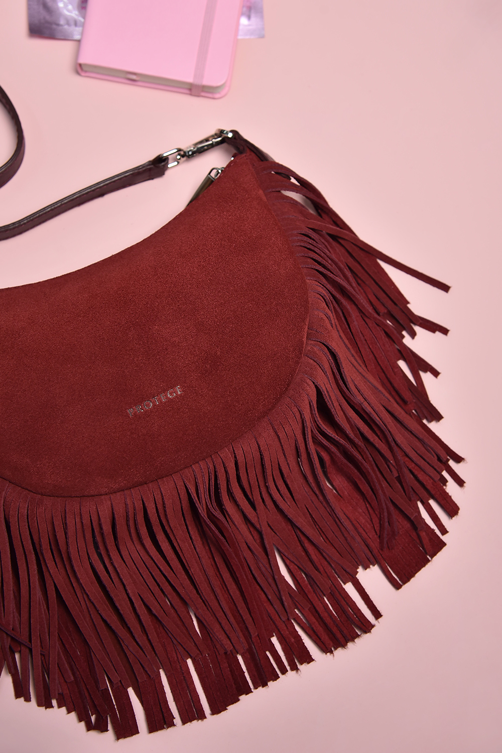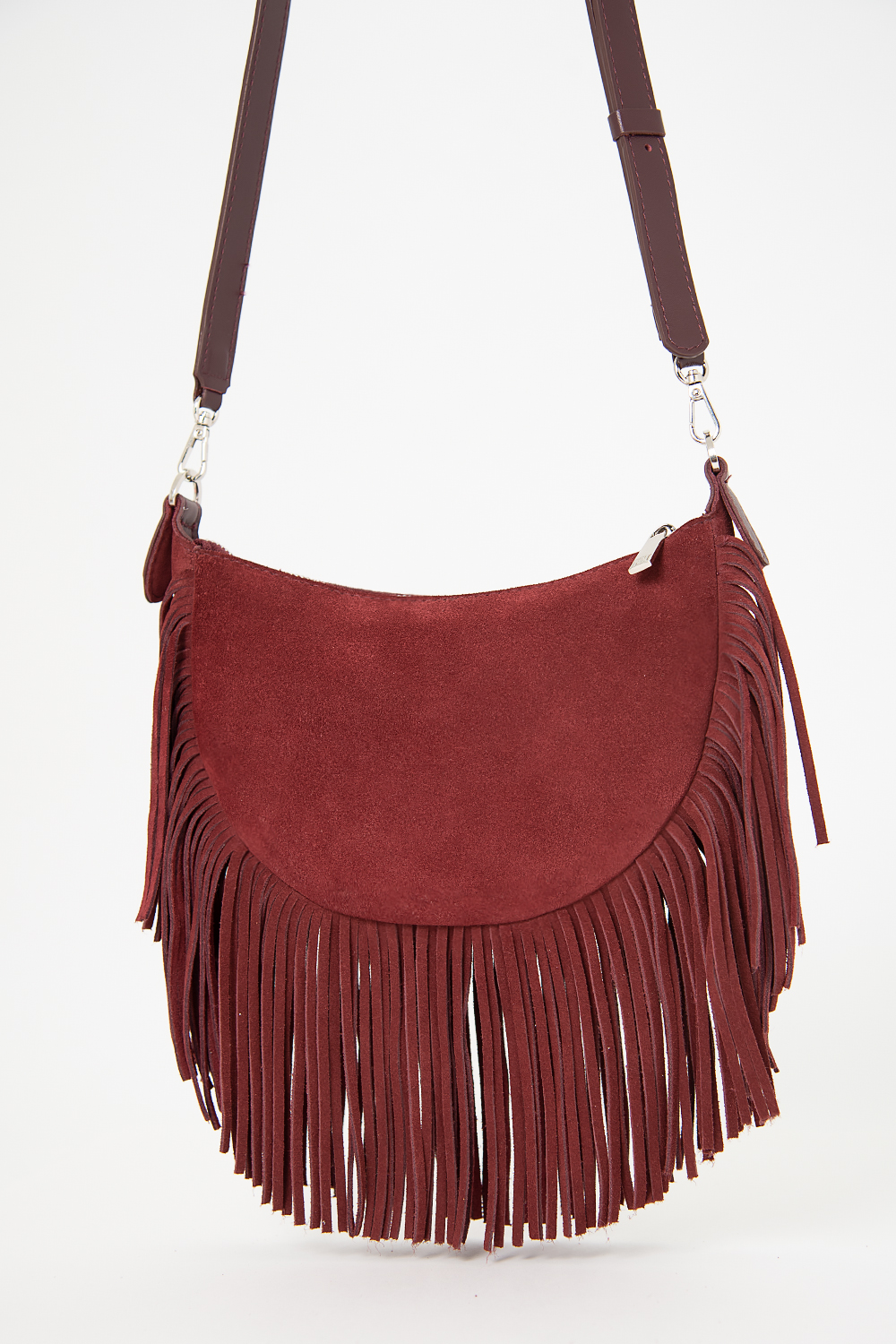 Сумка женская мягкой формы хобо. Имеет съёмный ремень с регулируемой пряжкой. Изделие с декоративной бахромой. Сумка на подкладке. Имеет одно отделение. Внутри есть карман на молнии. Глубокий бархатный оттенок бордо, нежная фактура замши и безупречный силуэт. Эта сумка - воплощение сдержанной роскоши и итальянского чувства стиля. Идеальный акцент для образа и уверенное заявление в повседневной элегантности. Visciolato. Для тех, кто ценит тактильные эмоции.